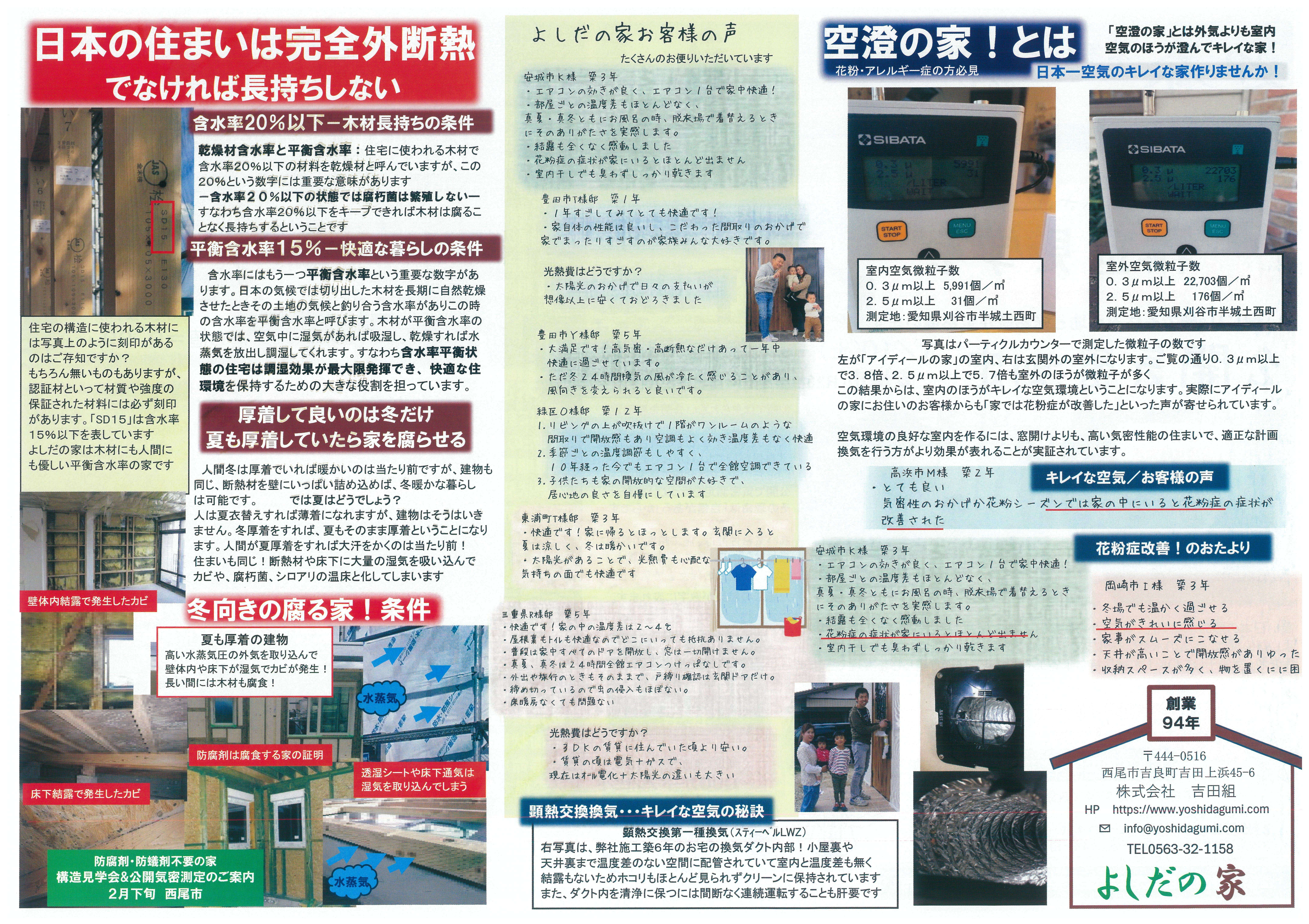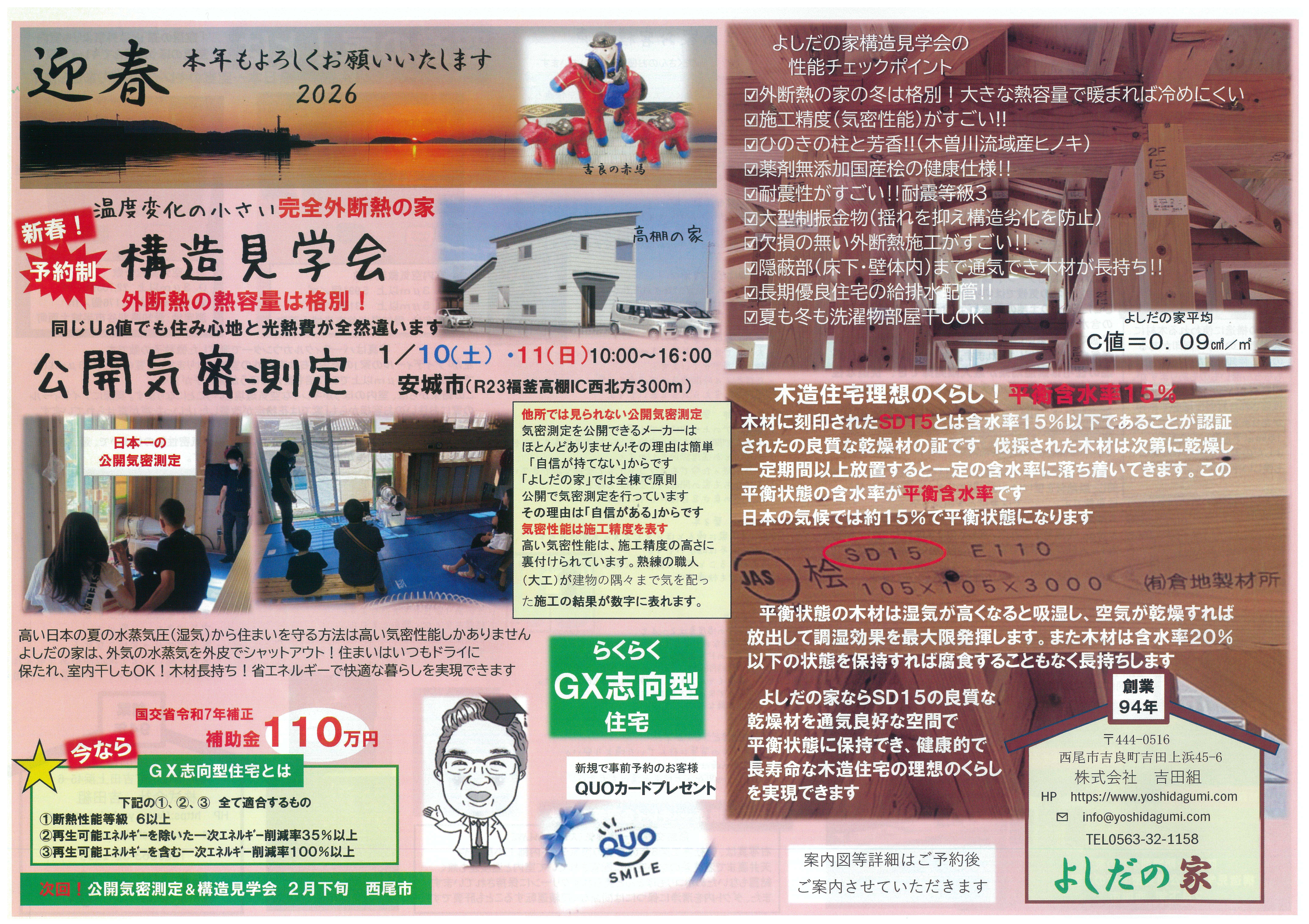 2026/01/05 構 造 見 学 会 公開気密測定 1月10日(土)、11日(日) 安城市 1月8日(木)中日新聞の折り込みチラシに入ります! 「もっと詳しく知りたい」「自分に合うプランを相談したい」 そんな方は、お気軽にお問い合わせください。 専門スタッフが、あなたにぴったりの住まいづくりをサポートいたします!!